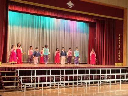 前半と後半の間でESDタイムの発表を行いました。ゆうゆう学級「響」、ウリホランイ学級低学年「ソゴチュン」、ウリホランイ学級高学年「チャンゴと両面太鼓」の発表をしました。