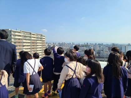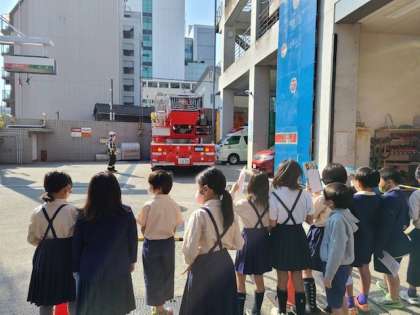 今日、3年生は消防署に社会見学に行きました。お話を聞いて、消防車や屋上などの施設の見学をさせていただきました。