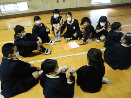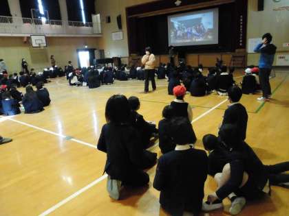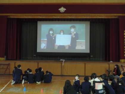 講堂ではたてわり班ごとに、各学級で考えたクイズを解きました。