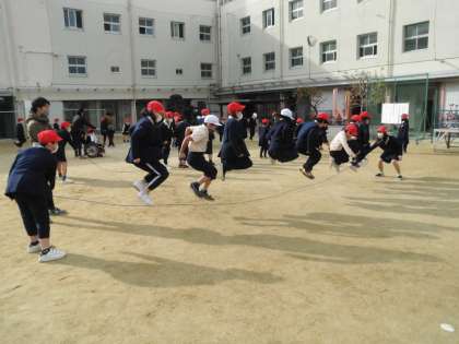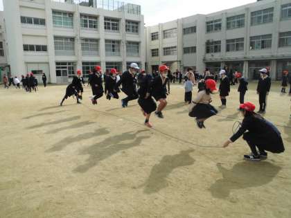 運動場ではたてわり班ごとに、大縄で交流しました。