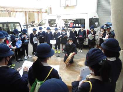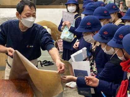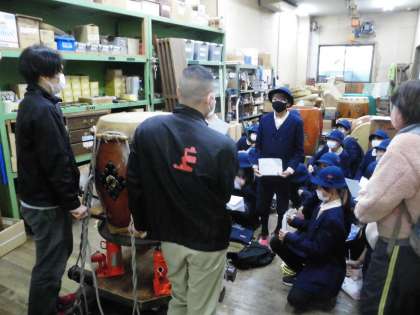 今日、5年生は社会見学で太鼓正へ行きました。地域学習の一環として、牛の皮がどのように太鼓になるのか、作り方や工程を見学させていただきました。