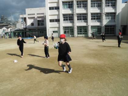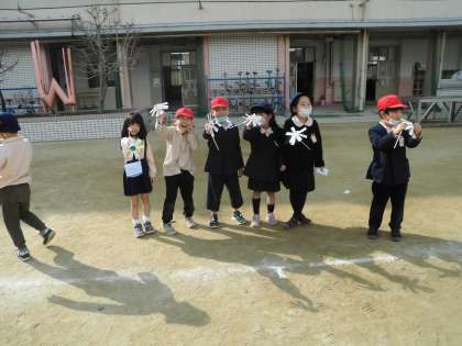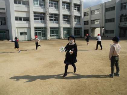 1年生は図画工作の学習で、紙コップを使って風車を作りました。今日は運動場へ出て、風で回るのを観察したり、走って回したりしました。