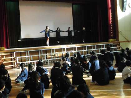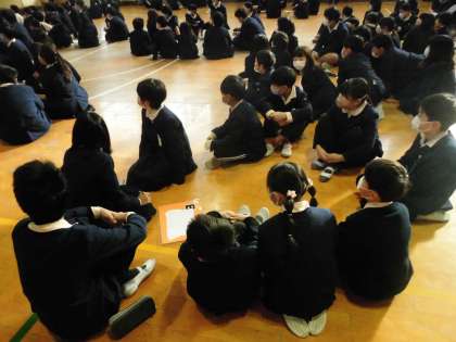 今朝はたてわり集会がありました。今日の集会は、ジェスチャーゲームを行いました。集会委員が行うジェスチャーをグループで相談して考えました。