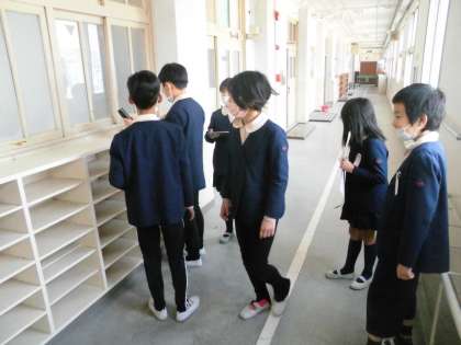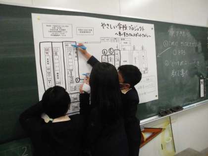 4年生は車いす体験の学習の延長で、校内の危険な場所はないか・優しい工夫はないかを調べました。教室に戻ってからは、拡大図にまとめました。