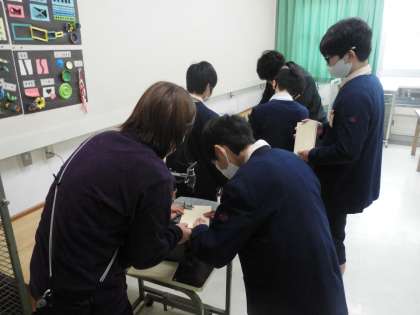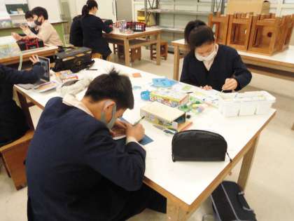 6年生では卒業記念の制作として、テープカッターづくりを進めています。木版を電動のこぎりで切り、絵を描いています。
