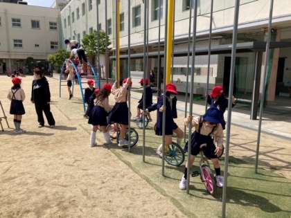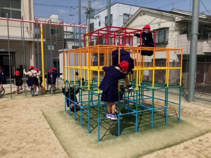 今日、1年生は運動場での遊び方や約束を確認してから元気よく遊びました。広い運動場や遊具に喜んでいて、楽しく過ごしました。