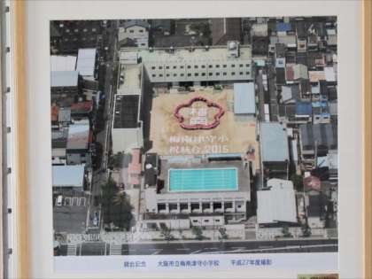 1学期に梅南津守小学校の開校記念に全校児童で撮影した。空撮写真が完成しました。正門玄関を入ったすぐの掲示板に展示しましたので、ご覧ください。(写真上)