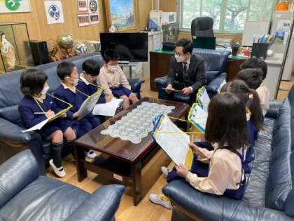 今日2年生は、1年生に校内の案内をする学校たんけんの事前インタビューを行いました。質問をしてメモをとるなど、がんばっていました。