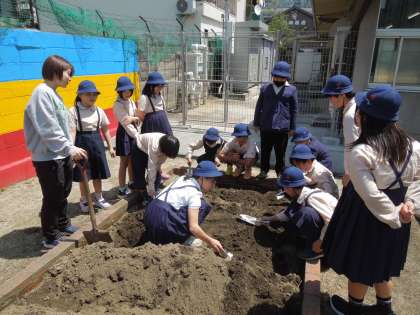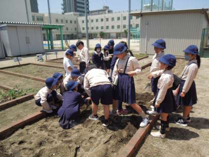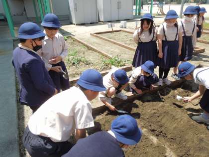4年生では植物を育て、観察するために学習園の整備を進めています。協力して耕していました。