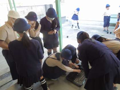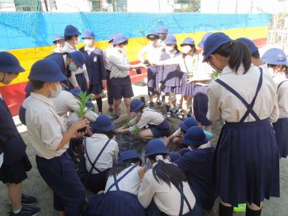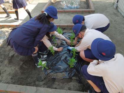 6年生は花壇にホウセンカを植え、ポットにインゲンマメとトウモロコシの種を植えました。成長した後、植物の観察を行います。