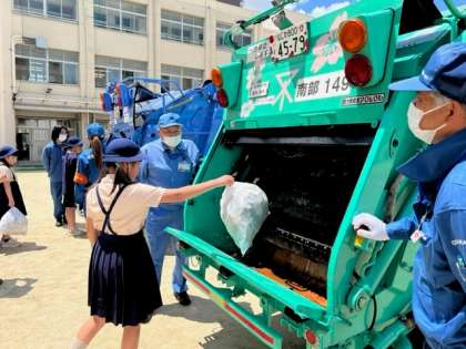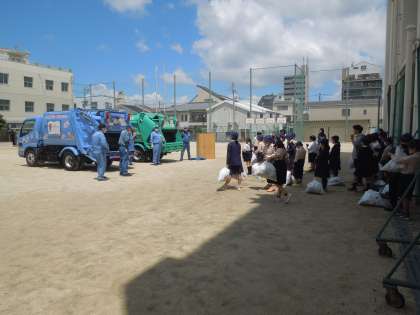 今日は、環境事業局の方にお越しいただき出前授業をしていただきました。動画を見た後はパッカー車にごみを入れる体験をしました。くらしを支える仕事について理解を深めることができました。