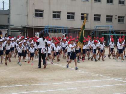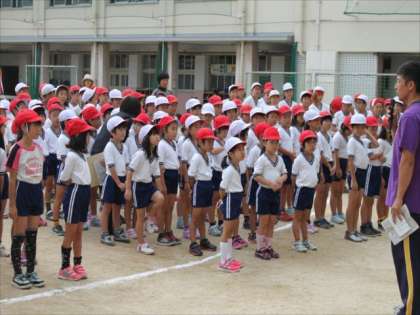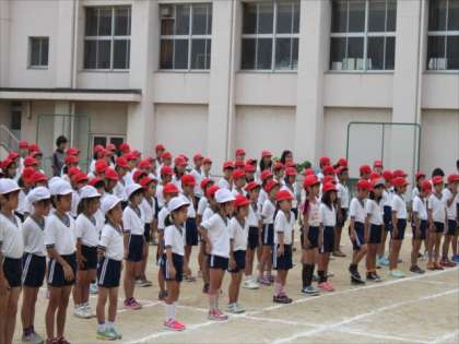 9月16日 第1回目の運動会全体練習がありました。統合して第1回目の運動会です。校旗、優勝旗、準優勝盾が新調されました。1年生にとっては初めての運動会です。