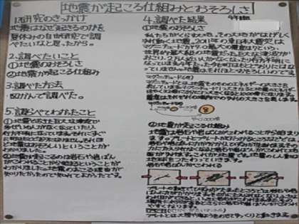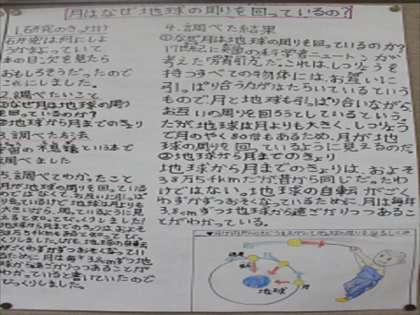 5,6年の自由研究は、以前にも紹介しましたが、4年生の自由研究も中身の濃い自由研究が多いです。何点化ご紹介します。(写真上 地震が起こるしくみとおそろしさ) (写真中 月はなぜ地球のまわりをまわっているか)(写真下 いのちの誕生と成長)ほかにも、すばらしい研究がたくさんありました。