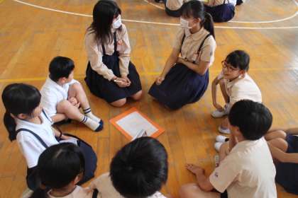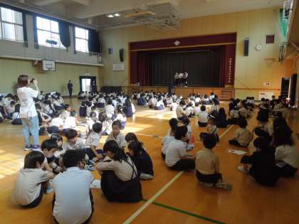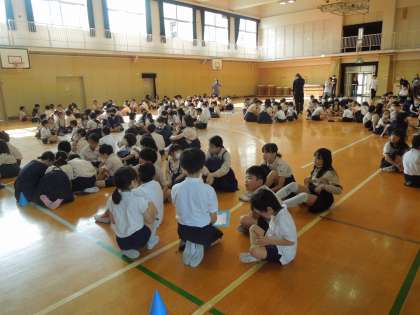 今朝はたてわり集会がありました。今日は声やヒントを聞いて先生は誰かを当てるクイズをしました。