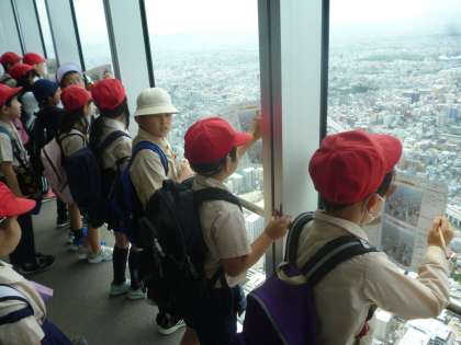 3年生は社会見学であべのハルカスへ行きました。ハルカスの展望台から、市内の様子を見学しました。