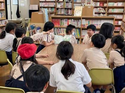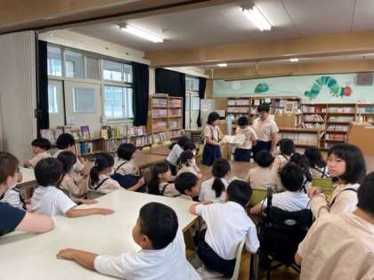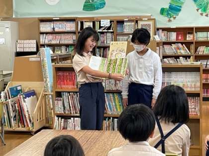 昼休みの図書館開放では、図書委員の児童が絵本の読み聞かせをしています。