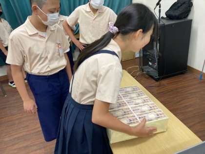本日、6年生は租税教室を行いました。税金の大切な役割について映像を見たり、お話を聞いたりしました。また、1億円のレプリカを持つ体験をさせていただきました。