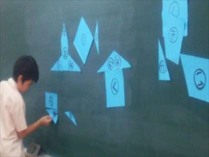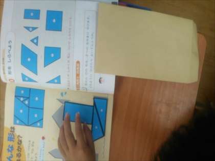 シルエットに合わせて形をつくるのに、何度も何度も三角形や四角形を動かして考えました。動かして考えながら、いろいろな形に親しむ2年生でした。