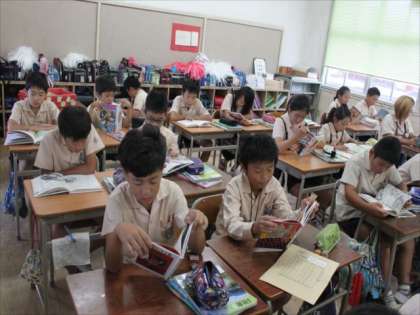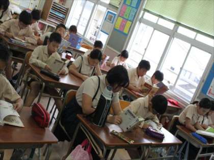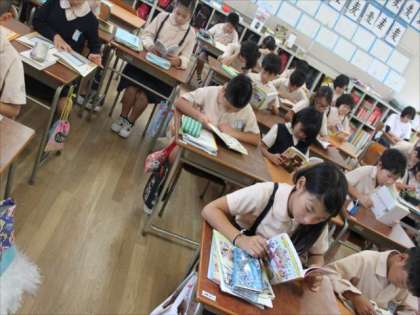 あらしの夜も明け、運動会を明後日に控えた朝です。オルゴールの音楽が静かに流れるなか、朝の読書タイムです。(写真上 6年)(写真中 5年) (写真下 4年)