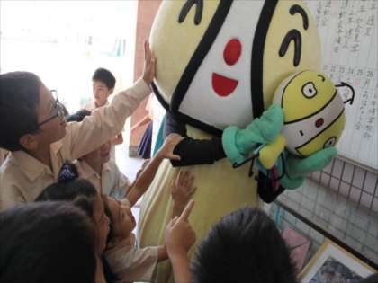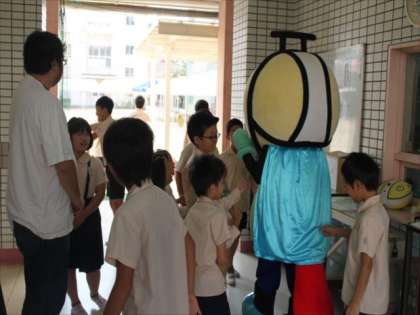 登校して、教室に荷物をおいてから、またジャガピーに会いに来る児童もたくさんいました。ジャガピー君は、明日の運動会にも応援に来てくれるそうです。