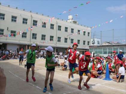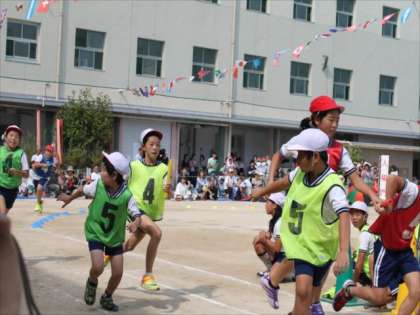 5年のリレーです。オリジナルの音楽に合わせて登場しました。スピードを落とさないようにバトンタッチもがんばっていました。