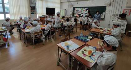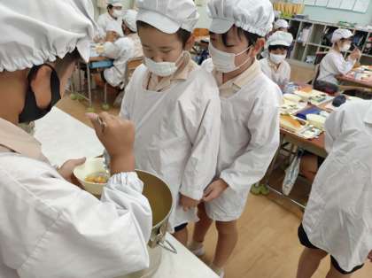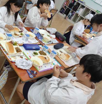 机を向き合わせマナーよく楽しく食べていました。今日はお誕生日ボーイがいて好きなおかずを少し多めによそってもらっていました。