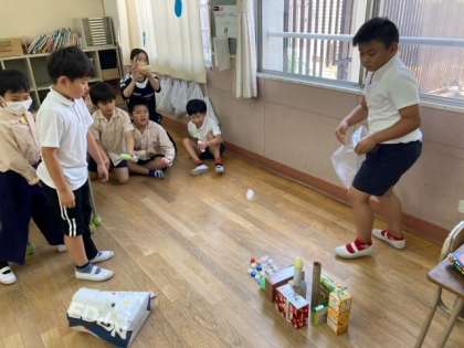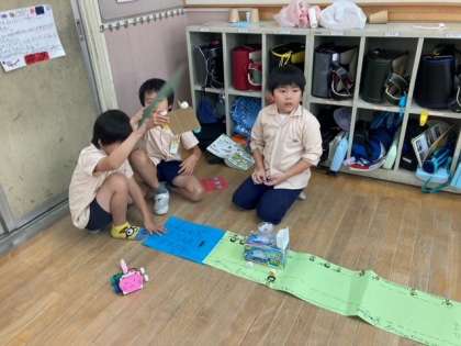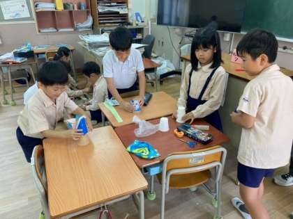2年生の生活科では、身近なものを使ったおもちゃ作りをしています。友だちが作ったものなど、色々と試し楽しんでいます。