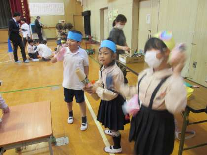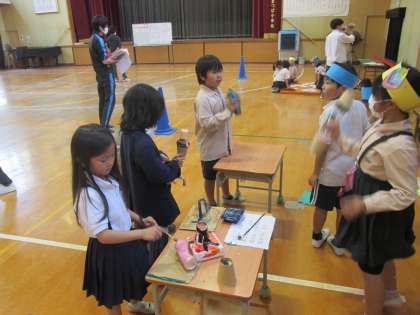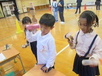 どんぐりや松ぼっくりを使って、楽器を作りました。