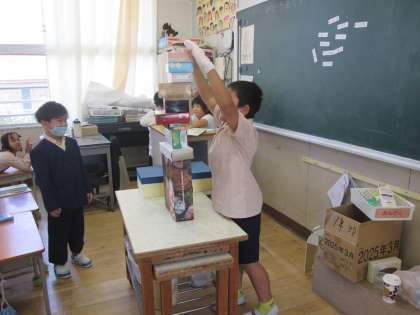 箱が何個積み上がるのかチャレンジし、みんなでドキドキしながら積みあがっていく様子を見ていました。