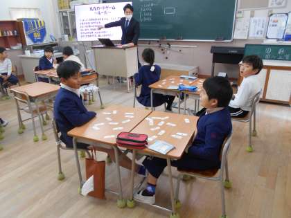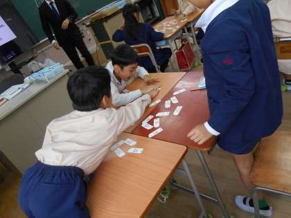 今日は、たしかめ問題をした後に、九九のカードゲームを2〜3人ペアで行いました。