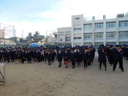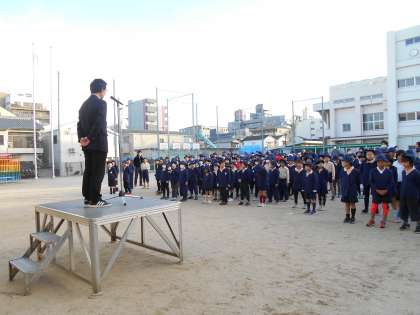 寒い中ですが、しっかりと全校朝会のお話を聞けていました。