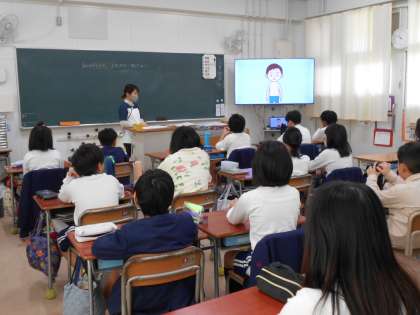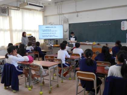 自分と相手、友だちとの距離感について〇×ゲームで盛り上がったあと、先生の話をしっかりと聞いています。