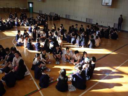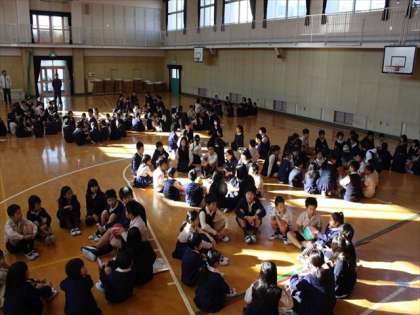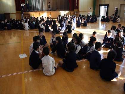 今日の児童集会は、ゲーム集会でした。班ごとに輪になって、「ごろごろ」といいながらボールを回していき、「ドン」でばくはつ、「ぴかぴか」(逆まわり)というゲームでした。