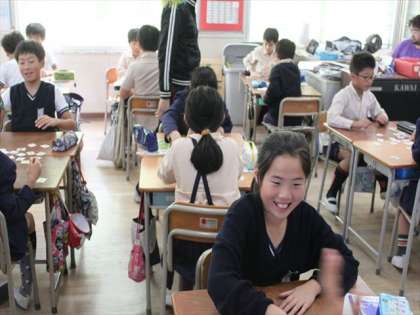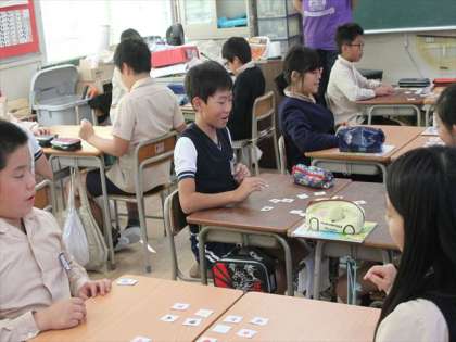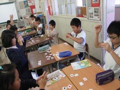 ノヤーハ先生による英語活動の時間でした。絵や色の異なるカードを用意して、先生が「グリーン」と言ったら、グリーンのカードをとり、ないカードなら手をたたくというゲームでした。「サークル」「スター」・・「レッドサークル」「ブルースター」など複合もありました。
