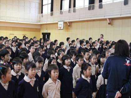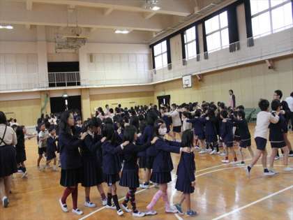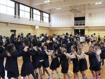 今朝の児童集会は、学習発表会で歌う「ドレミの歌」の練習とじゃんけん列車でした。