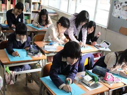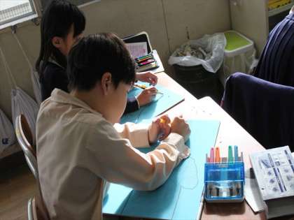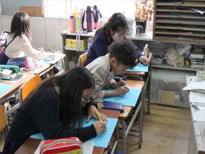 4年生が版画の製作中です。「リコーダーとわたし(ぼく)」というタイトルで、けがをしないようにていねいに彫り進めています。