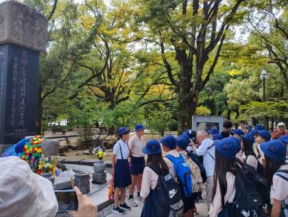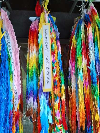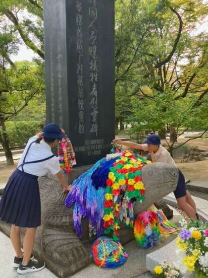 平和への願いを込めてまつば小学校全員で作った「折り鶴」「折り亀」を届けました。
