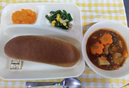 今日の献立は、ビーフシチュー、ベーコンとさんどまめのソテー、みかんのかんづめ、バター、コッペパン、牛乳でした。