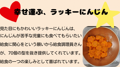 ビーフシチューには給食調理員さんが、花型や星型に型抜きした「ラッキーにんじん」が1クラス5コ程度入っています。