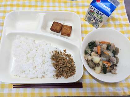 今日の献立は、鶏肉とじゃがいもの煮もの、あつあげのしょうゆだれかけ、紅ざけそぼろ、ごはん、牛乳です。