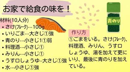 紅ざけ(フレーク)に、いりごま・青のりとご家庭に常備しているもので簡単に作ることができる献立ですので、ぜひご家庭でも給食の味を味わってください。