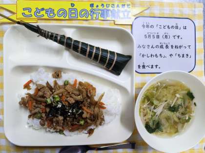 今日の給食は、一足早い「こどもの日の行事献立」ということで、きんぴらちらし、五目汁、ちまき、牛乳がでていました。