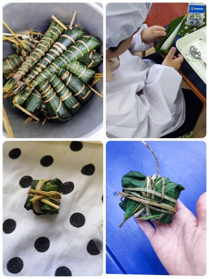 先生の声掛けでおいしく食べた後は上手に片付けよう!ということで食べ終わった後は、葉を折りたたみ丸めて紐で結び、ごみをできるだけ小さくし、給食調理員さんが片付けやすいようにチャレンジしていました。