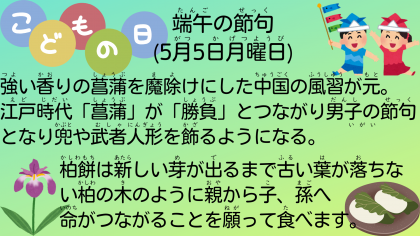大阪市の学校給食では、こどもの日の行事献立に【ちまき】が登場します。大阪市の学校給食用に作られた【ちまき】は程よい甘さで上品な味わいです。こどもの成長を願って、おいしくいただきました。
