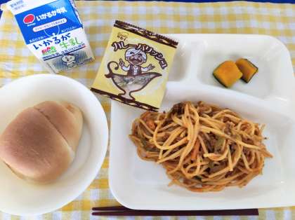 今日の給食はミートソーススパゲッティ、焼きかぼちゃ、カレーフィッシュ、ミニコッペパン、牛乳でした。