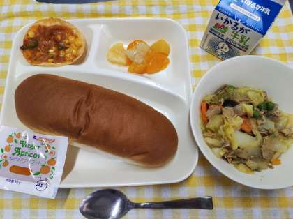 今日の給食は豚肉と野菜のカレースープ煮、変わりピザ、ミックスフルーツの缶詰、コッペパン、アプリコットジャム、牛乳でした。