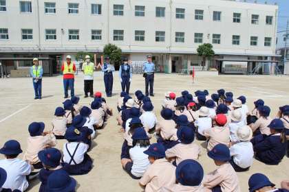 西成警察署とじゃがパト隊の方に来ていただき、交通安全指導を行いました。