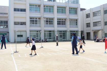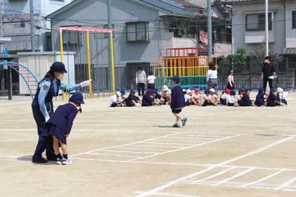 運動場に道路の線を引き、実際に歩く練習をしました。車やバイク、自転車が来ていないかしっかりと確認してから道路を渡ったり、横断歩道を渡ったりと安全に過ごすために大切なことを学びました。