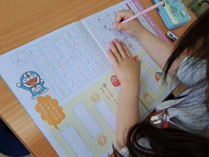 50音すべてのひらがなを習いました。ひらがなをすべて習ったので、50音の表をうつしました。はじめはたくさんのひらがながあって、驚いていましたが、いざ書き始めると、どの子も集中して予定していたよりも早く丁寧に書くことができていました。