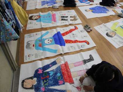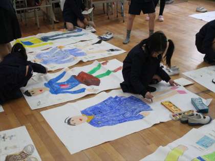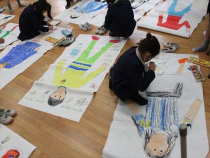 2−2「実物大のわたし」が完成しました。なかなかの力作ぞろいで、迫力があります。教室内に掲示されるのが楽しみです。